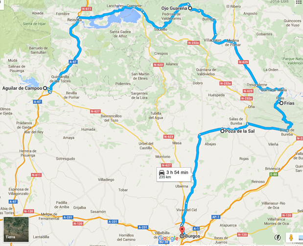 Punto de salida de la Ruta, como siempre damos un punto conocido intermedio, al que se recomienda llegar desde el punto de origen personal, y que nos ayuda a centrar la ruta.Para ver mapa pulsar: Aguilar de Campoó (PA) – Ojo deGuareña (BU) – Frías (BU) – Poza de la Sal (BU) – Burgos